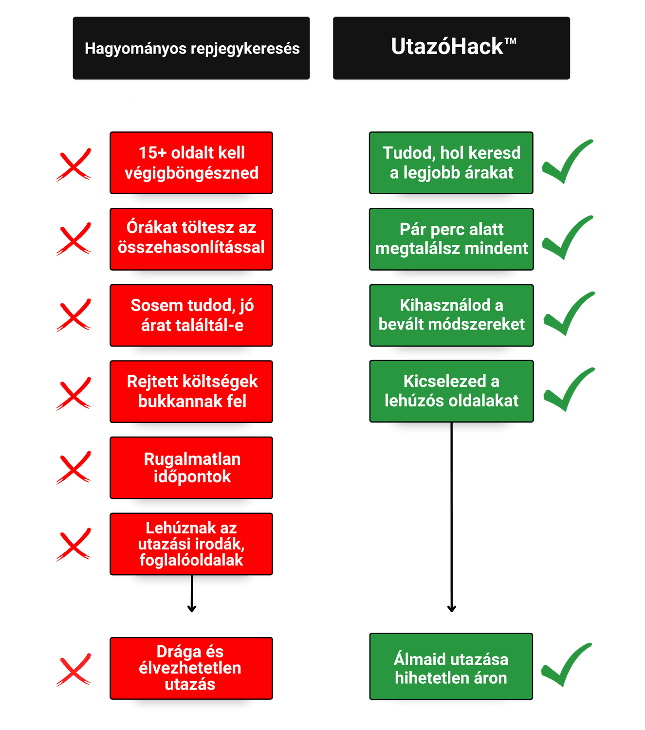 Az Utazóhack™ egy sosem látott repülőjegy foglaló módszer, melynek köszönhetően a lehető legolcsóbb áron juthatsz el álmaid helyszínére, anélkül, hogy egy vagyont kellene költened rá.